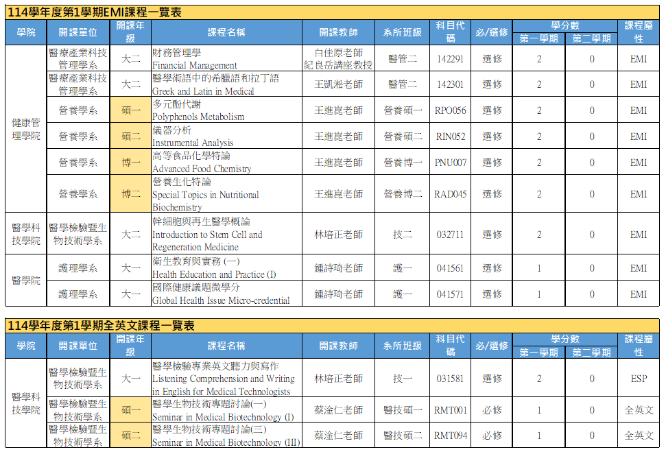114學年度第1學期 EMI & 全英文 課程一覽表